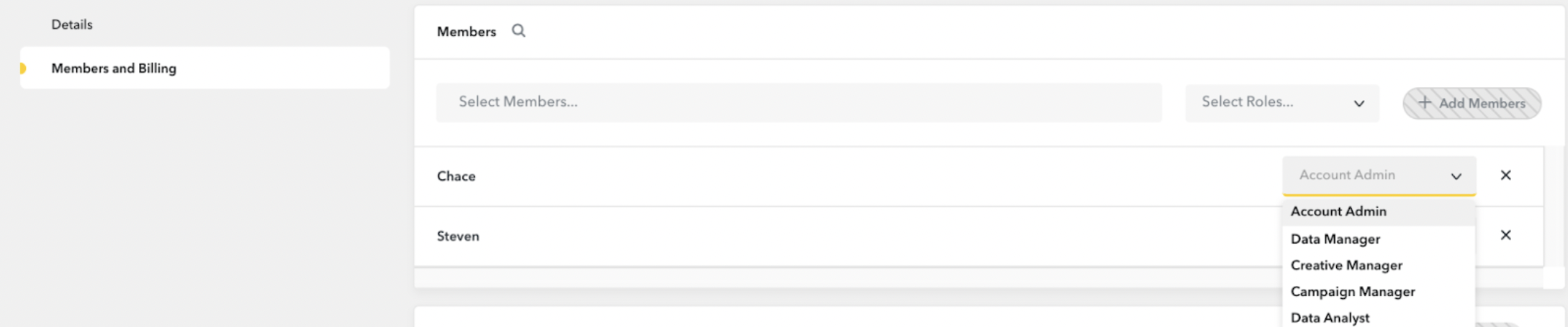 Locate and select your Ad account > Members and Billing